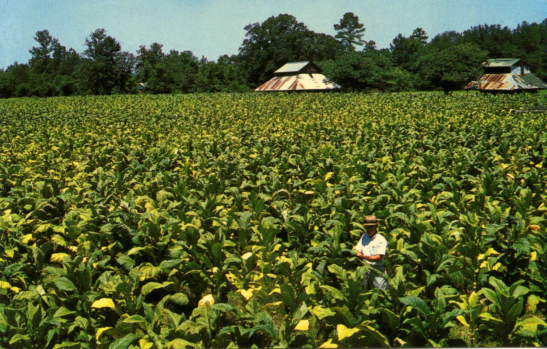Tobacco is the most stable crop planted on farms surrounding Myrtle Beach and Conway, South Carolina. This crop is just ready for pulling and one of Harry County's most famous sharecroppers, John Monroe Johnson Holiday, is seen sizing up the leaf for tomorrow's cropping. Curing barns are in the background.